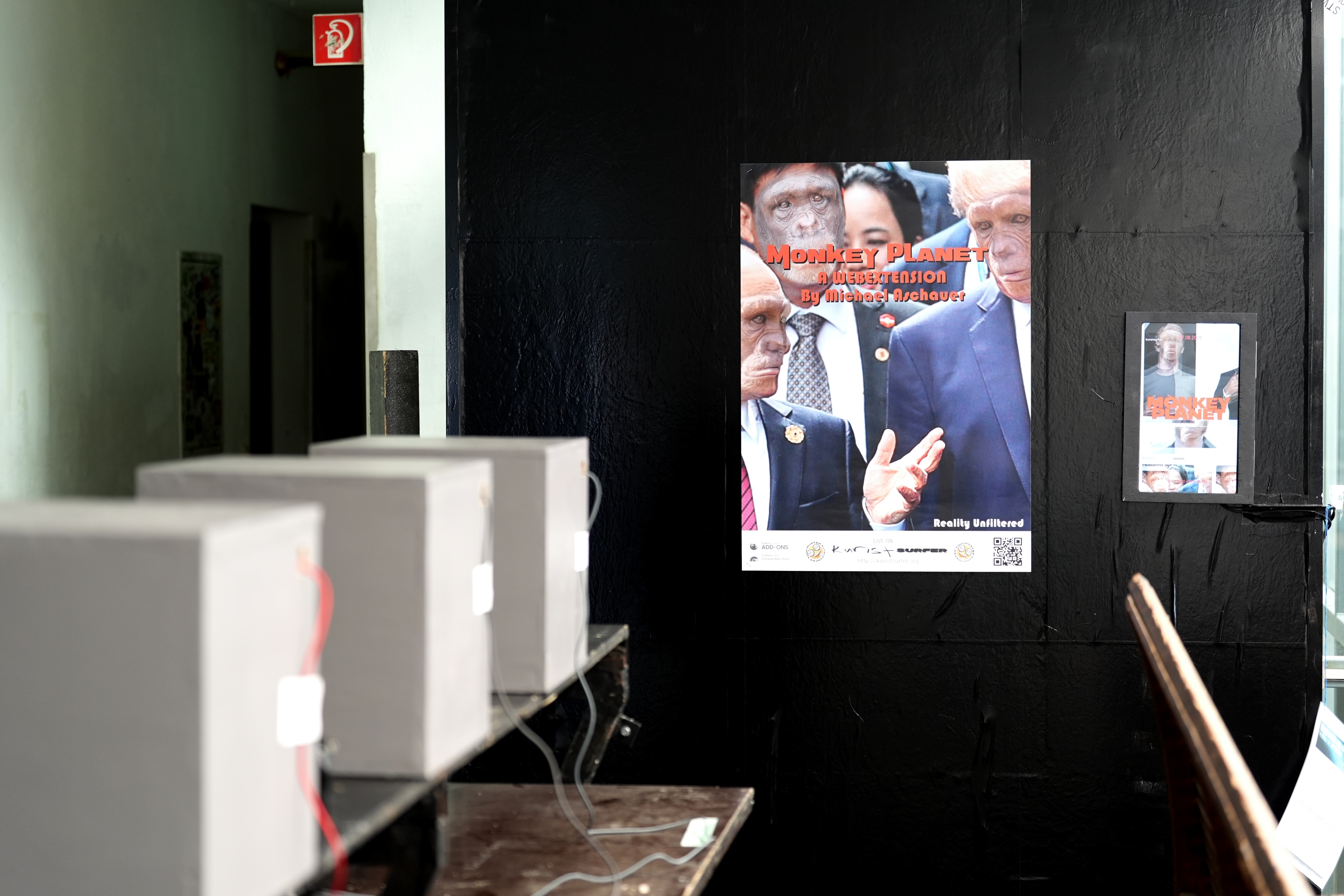 Der Künstler und Programmierer Michael Aschauer gibt in seinem Projekt Monkey Planet, das er für den browserbasierten Online-Kunstraum Kunstsurfer konzipiert hat, eine humorvolle und zugleich kritische Antwort. Er adaptiert dabei die Browsererweiterung Kunstsurfer so, dass alle menschlichen Gesichter auf besuchten Webseiten durch Affengesichter ersetzt werden. Das Ergebnis ist eine entpersönlichte Medienlandschaft, in der der Homo sapiens seine visuelle Dominanz verloren hat.