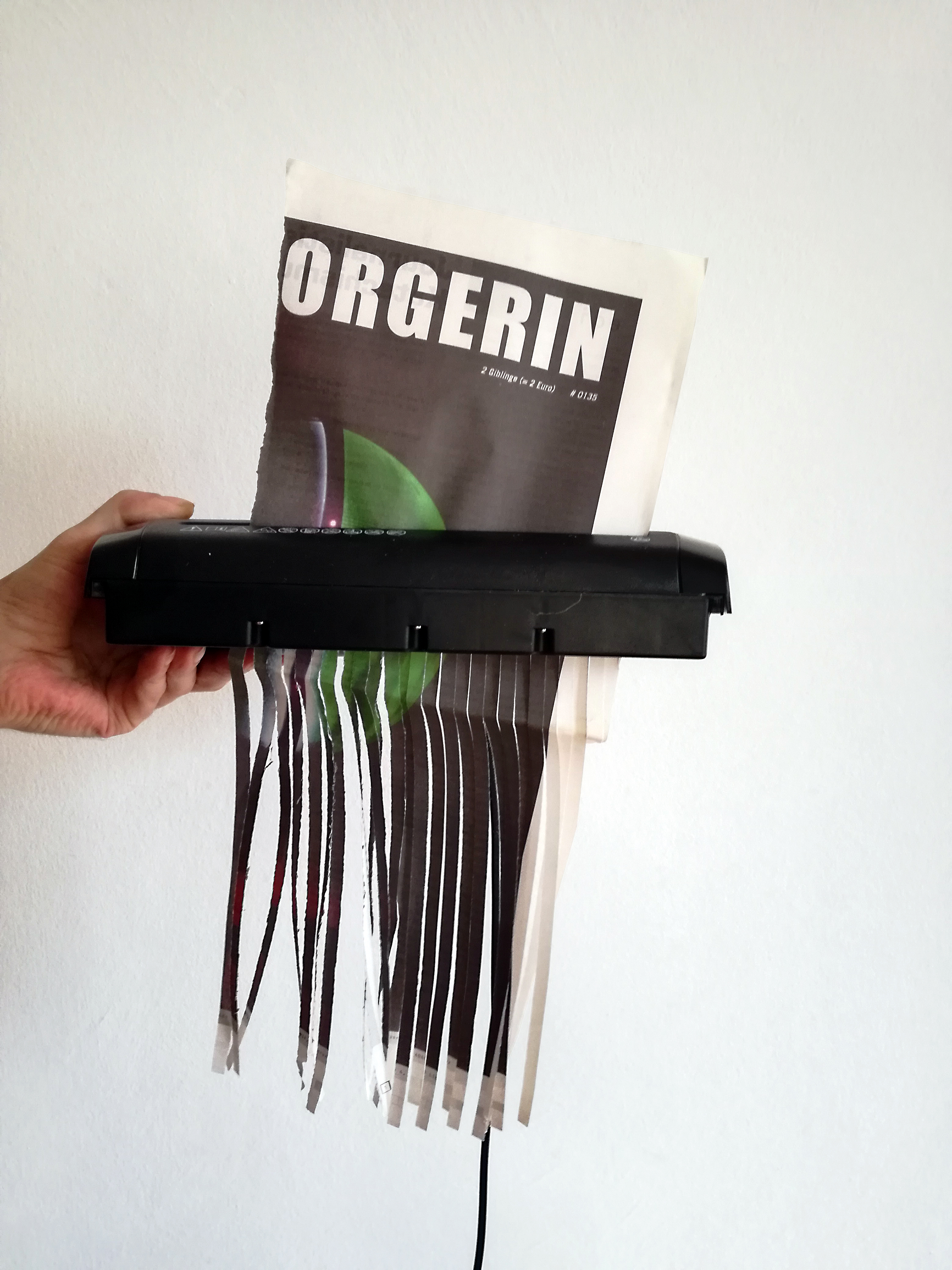 Astrid Benzer: Mit Papierstreifen und geschredderten Inhalten der STWST-Zeitung Versorgerin werden zig Jahre Kritik und Gestaltung unkenntlich gemacht und streifenweise wieder neu im Haus angebracht – als Navigationssystem der Kritik, mit unklarem Ziel.