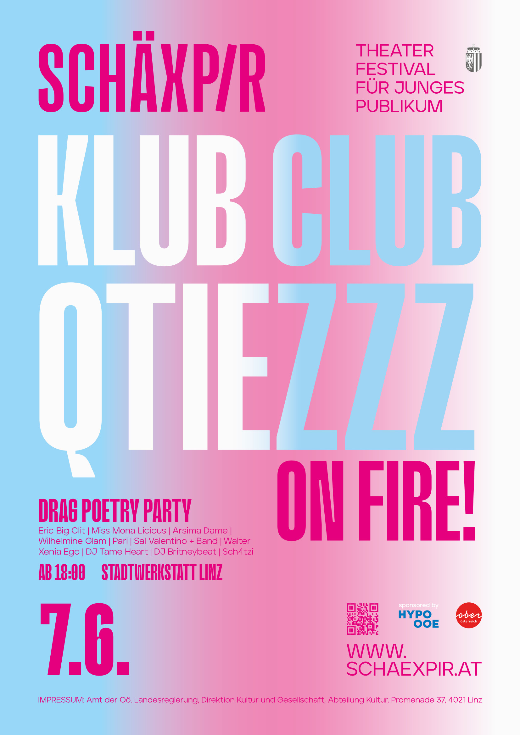 Der KLUB CLUB des SCHÄXPIR Festivals präsentiert QTiezzz on Fire. Gemeinsam laden wir zu einem fulminanten Abend in die Linzer Stadtwerkstatt ein. In einem hybriden und immersiven Setting zwischen Party, Drag-Show, Poetry und Konzert stehen TINA*s im Mittelpunkt und Rampenlicht. Gemeinsam lassen wir die Grenzen zwischen drinnen und draußen, Publikum und Bühne sowie Party und Performance verschwimmen und dekonstruieren dabei stereotype Geschlechterbilder.