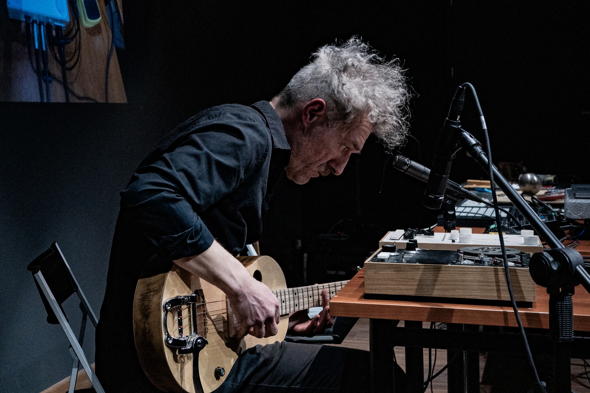 Federico Visi wird mit dem Sophtar auftreten, einem vernetzbaren Feedback-Saiteninstrument mit eingebautem maschinellem Lernen, das er kürzlich entworfen hat. Mithilfe von Aktuatoren und maschinellen Lernmodellen kann das Instrument auf menschliche und algorithmische Spieler reagieren und wird so zu einer Plattform für elektroakustische Mensch-Maschine-Co-Improvisation.