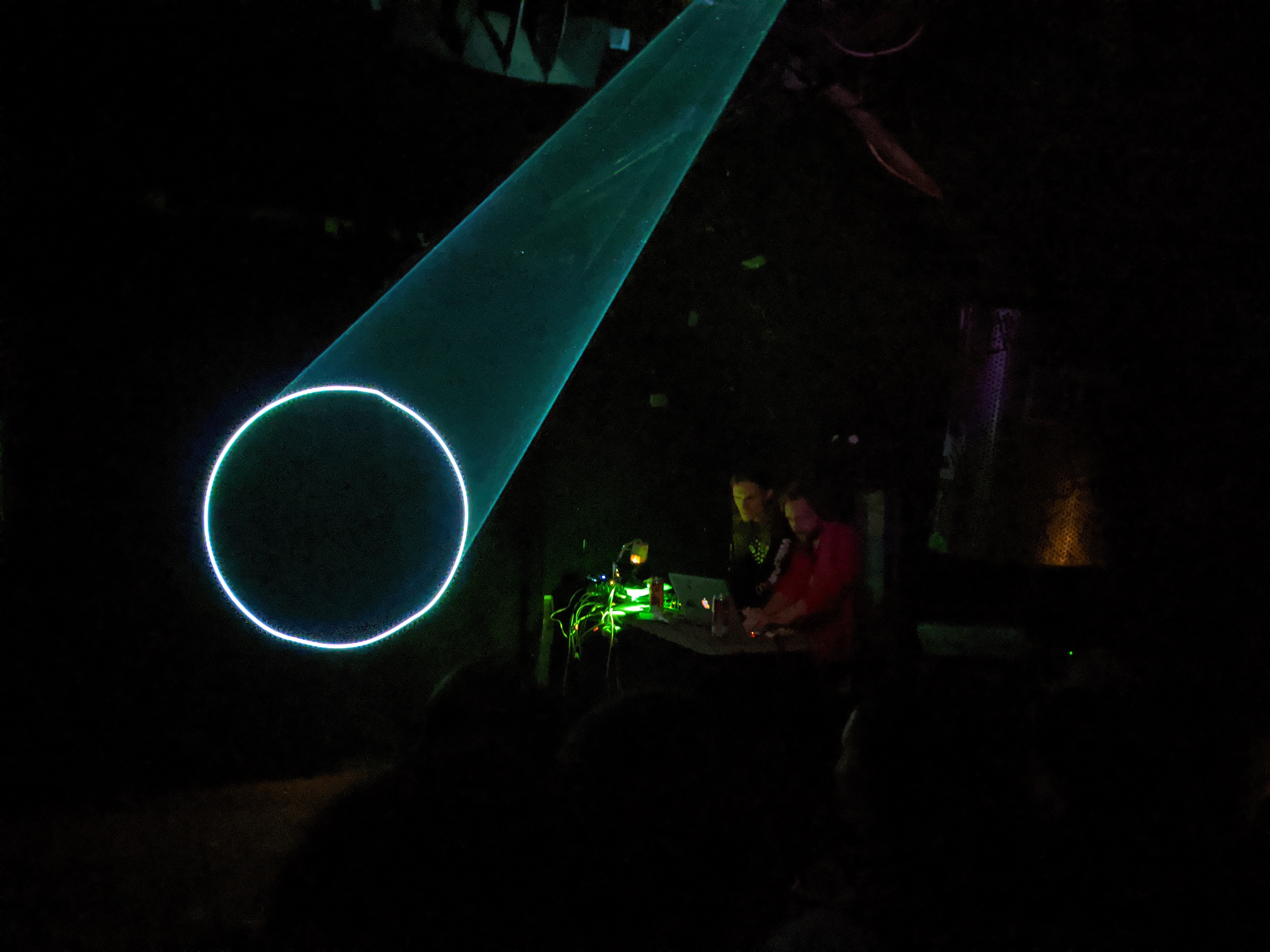 Oscilloscope Music ist das audiovisuelle Projekt von Jerobeam Fenderson und Hansi3D, bei dem Bilder mit Ton gezeichnet werden. Die leuchtend grünen Linienzeichnungen eroberten das Internet im Sturm, als 2016 ihr erstes selbstbetiteltes Album erschien, und sie veröffentlichten ihr zweites Album N-Spheres Ende 2024 auf Diskette. Bei ihren Liveshows haben sie von analogen Oszilloskopen auf Hochgeschwindigkeits-Multiwellenlängen-Laser umgestellt und schicken das Publikum auf eine omnisensorische interdimensionale geometrische Raumerfahrung.